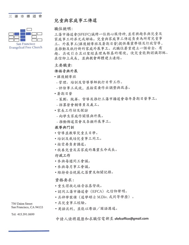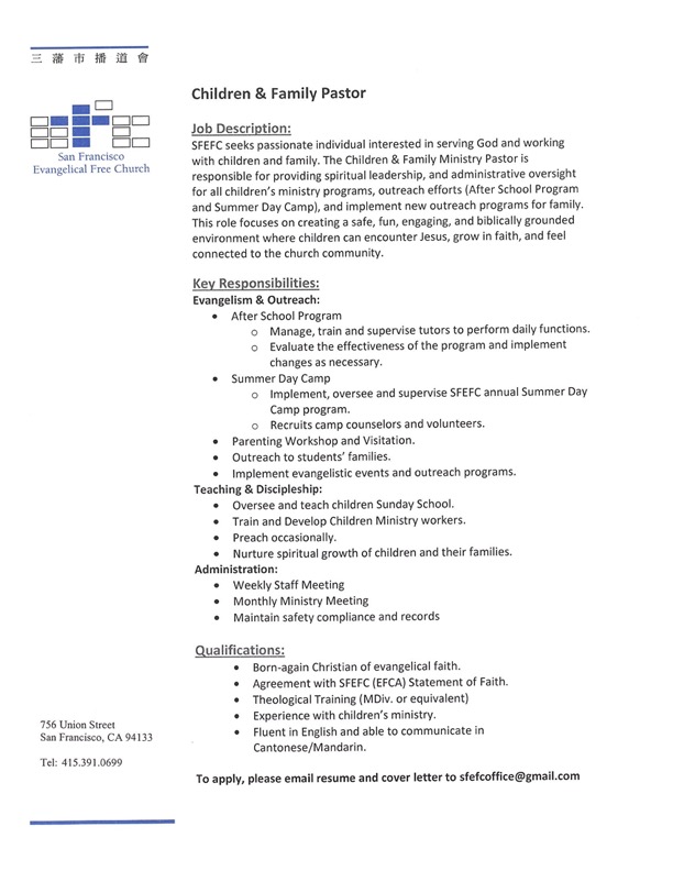 SFEFC seeks passionate individual interested in serving God and working with children and
